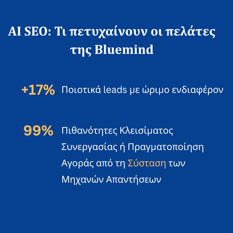Γιατί η Bluemind δεν εφαρμόζει το AI SEO ως “μόδα”· το ανέπτυξε πρώτη στην Ελλάδα το 2023 και το εξελίσσει συνεχώς.